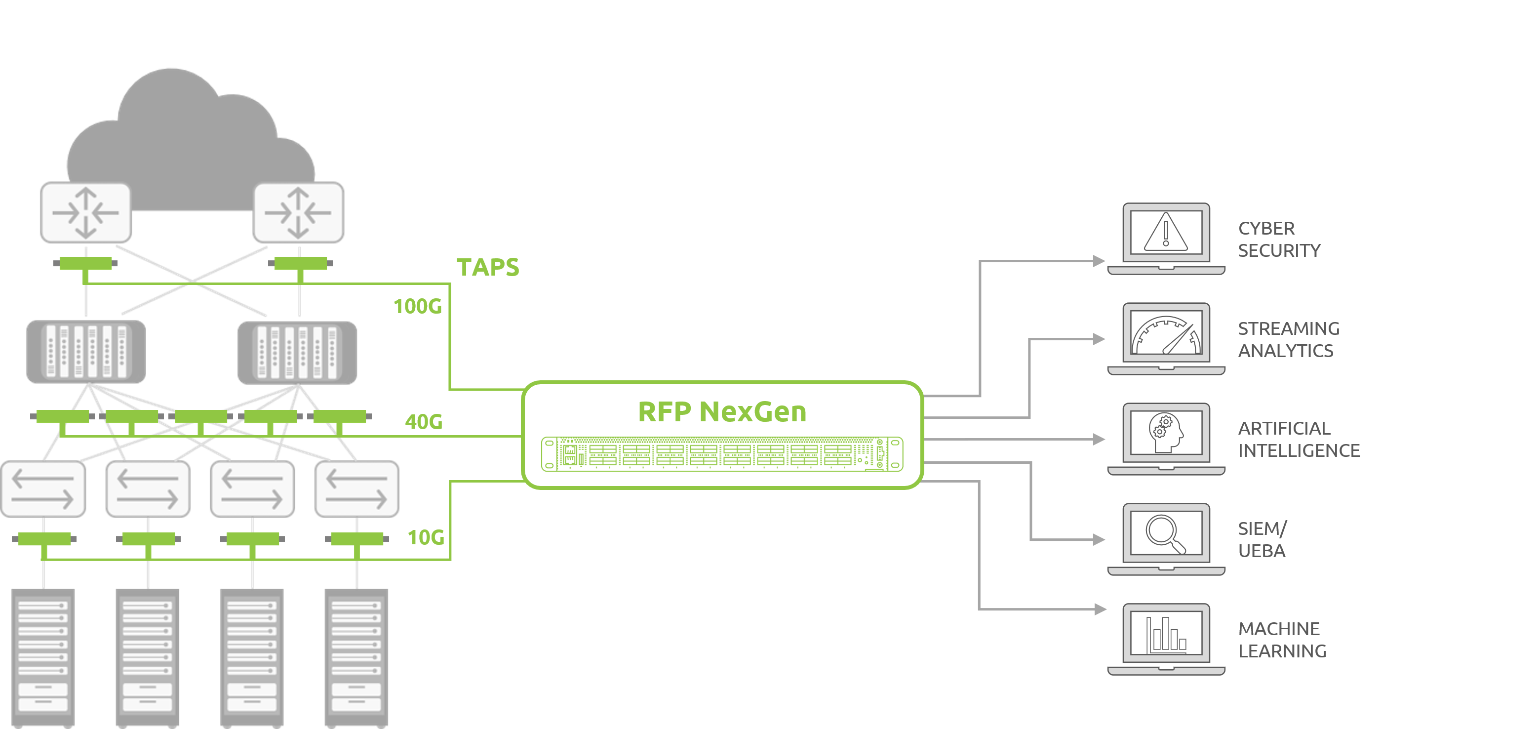 Frame Processors come in a variety of form factors and leverage flexible "network interface" options for high-speed networks. For example, our (MantisNet's) flagship Frame Processor, the Reconfigurable Frame Processor Next Generation (RFP-NG) is a (32) port, QSFP28 based 1U appliance that is capable of monitoring 10/25/40/50/100G links at line-rate. The device can ingest multiple high-speed network links and load-balance the traffic across the multiple 10G ports (for FULL-Fidelity visibility monitoring.) The RFP-NG can also apply line-rate filters on 100G traffic to skinny down the total volume and egress only the traffic of interest out of a single 10G port (for TARGETED visibility monitoring.)